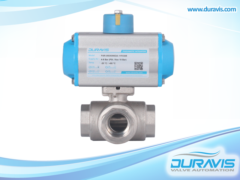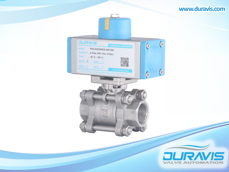 Double and Single Acting DURAVIS pneumatic actuated 2/2 way, brass, thread connection, ball valves are used to on/off and proportional control of various fluids. DURAVIS pneumatic actuated valves; provide a wide range of options such as namur solenoid valves, limit switch boxes, positioners and other accessories.